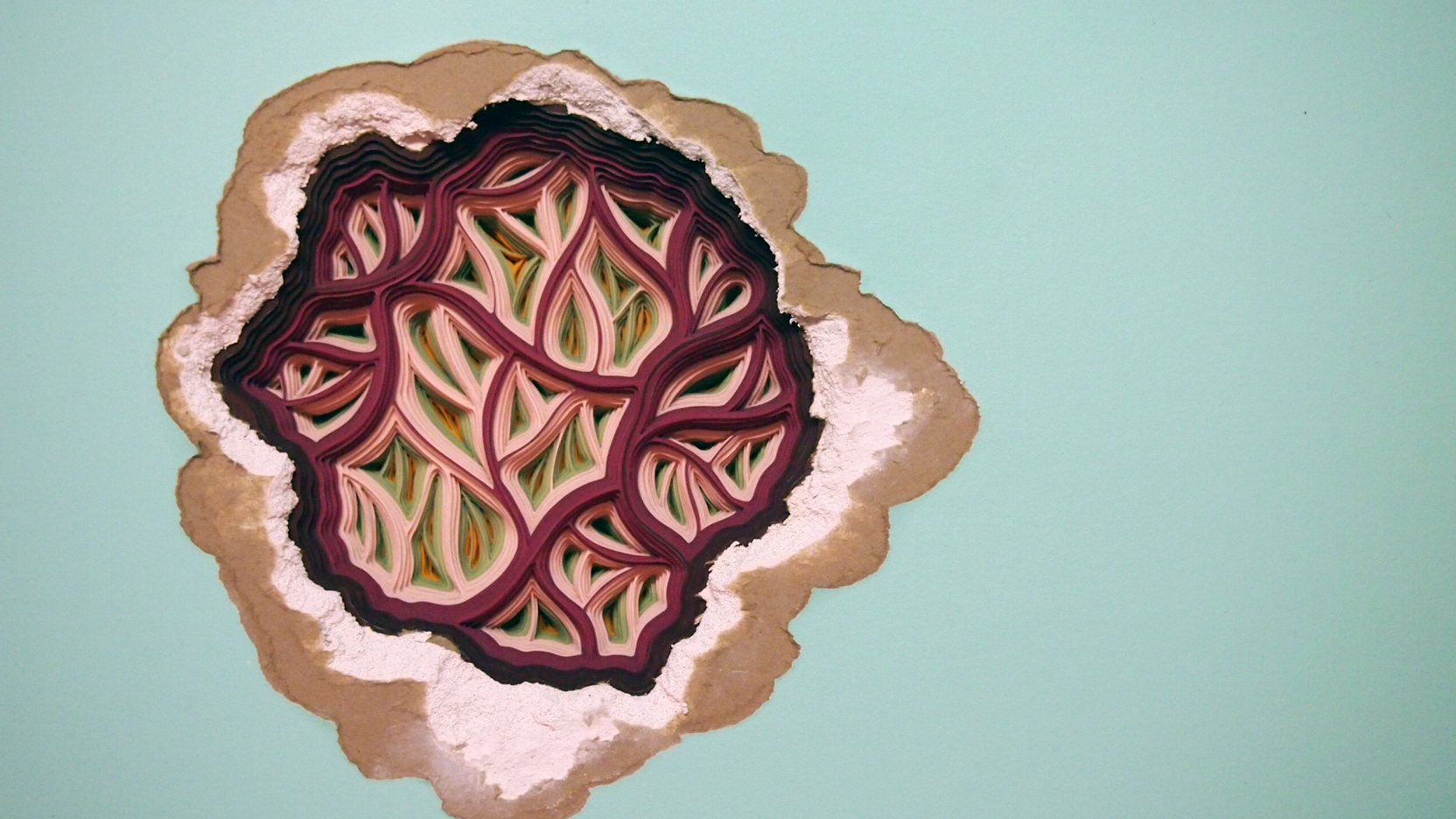 I use paper to create a world of fiction that challenges the viewer to suspend disbelief and venture into my fabricated reality. By layering paper I am able to build intriguing land formations that mimic viral colonies and concentric sound waves. These strange landmasses contaminate and infect the surfaces they inhabit transforming the space into something suitable for their gestation. Towers of paper and color jut into the viewer's space inviting playful interactions between the viewer and this conceived world. These constructions question the notion of microbial outbreaks and their similarity to the visual representation of sound waves, transforming them into something more playful and inviting.